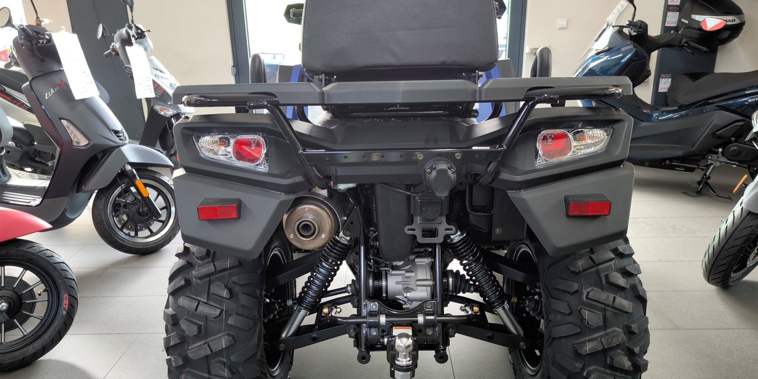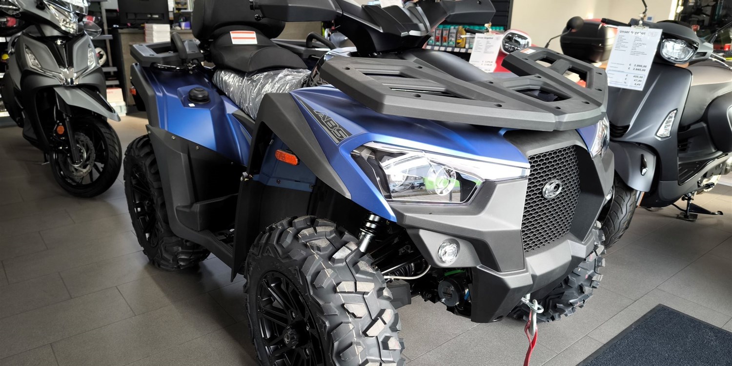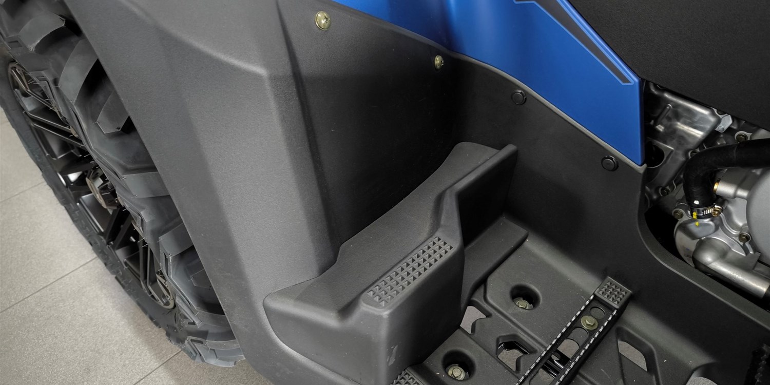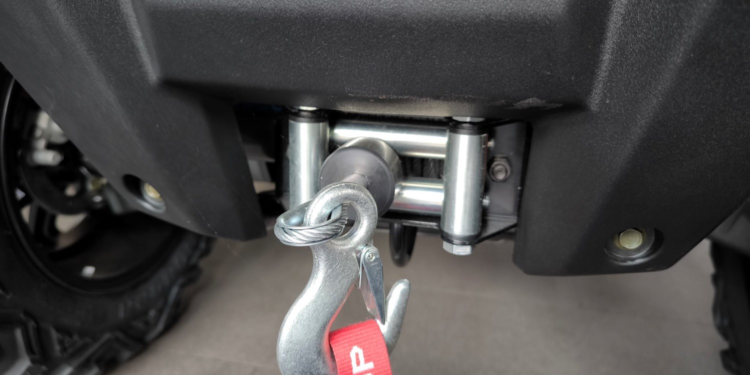 Und das ist noch längst nicht alles. Zur Vollausstattung gehören zum Beispiel eine elektronische Lenkunterstützung, die geschwindigkeitsabhängig reagiert, eine kräftige Seilwinde, stufenlose Variomatik, zuschaltbarer Allradantrieb und Differenzialsperre vorne, Untersetzungsgetriebe, Bergabfahrhilfe, Anhängerkupplung, zentrales LCD-Cockpit und sportliche Doppelspeichen-Felgen mit Maxxis Bighorn Reifen.