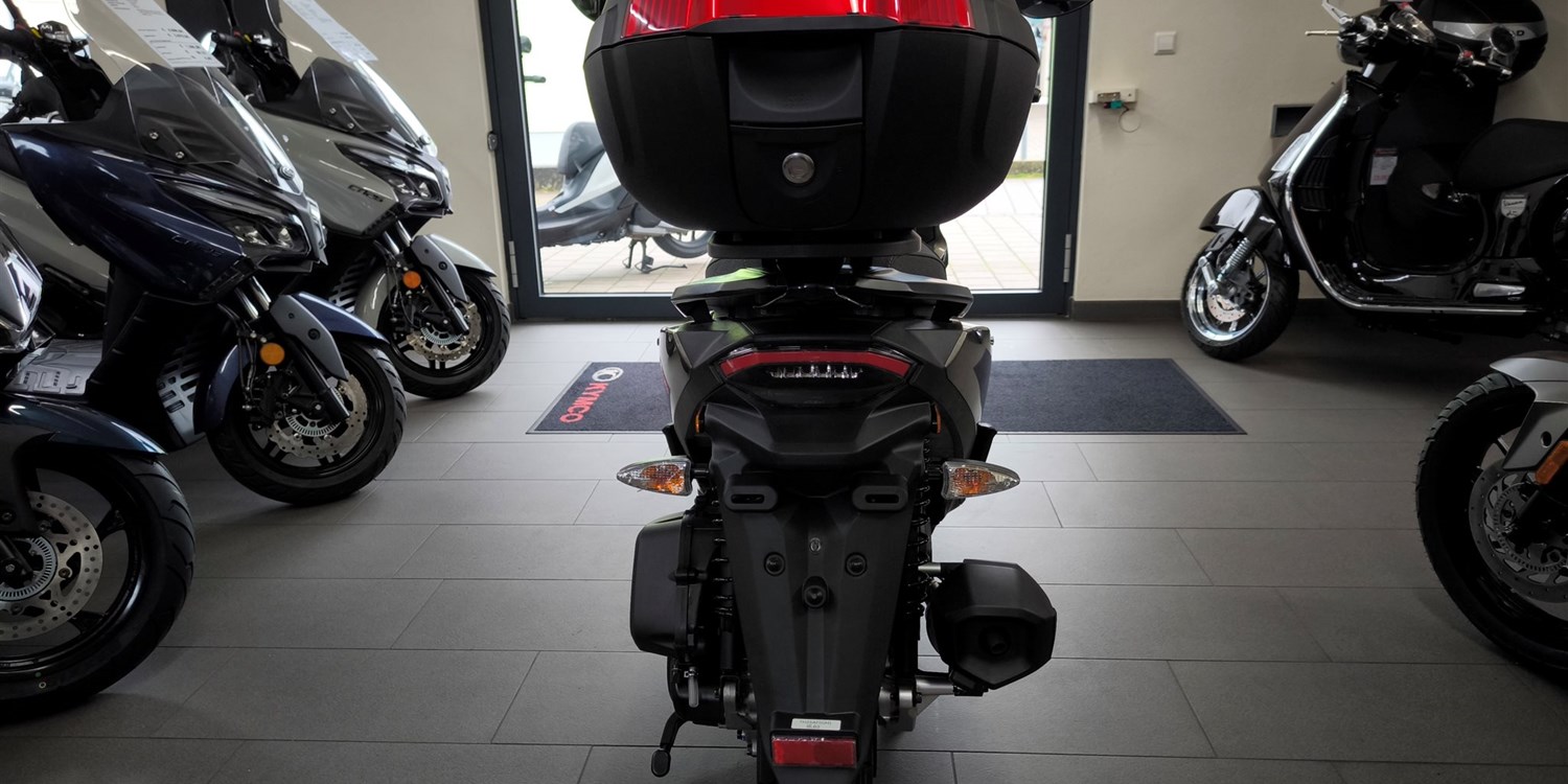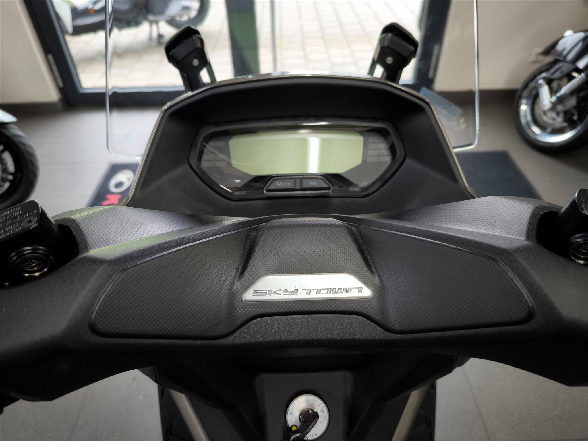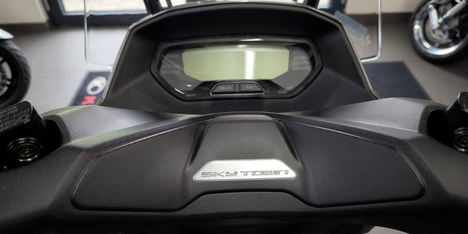 Im Alltag punktet der SKY TOWN 125i ABS mit einem praktischen Stauraum unter der Sitzbank, der Platz für einen Integralhelm bietet, sowie mit einem serienmäßigen Topcase zur Erweiterung des Ladevolumens. Ein USB-Anschluss (Typ A & C) ermöglicht das bequeme Laden mobiler Geräte. Das LCD-Dashboard zeigt alle relevanten Fahrdaten übersichtlich an, das Windschild sorgt zudem für verbesserten Komfort bei längeren Strecken.
