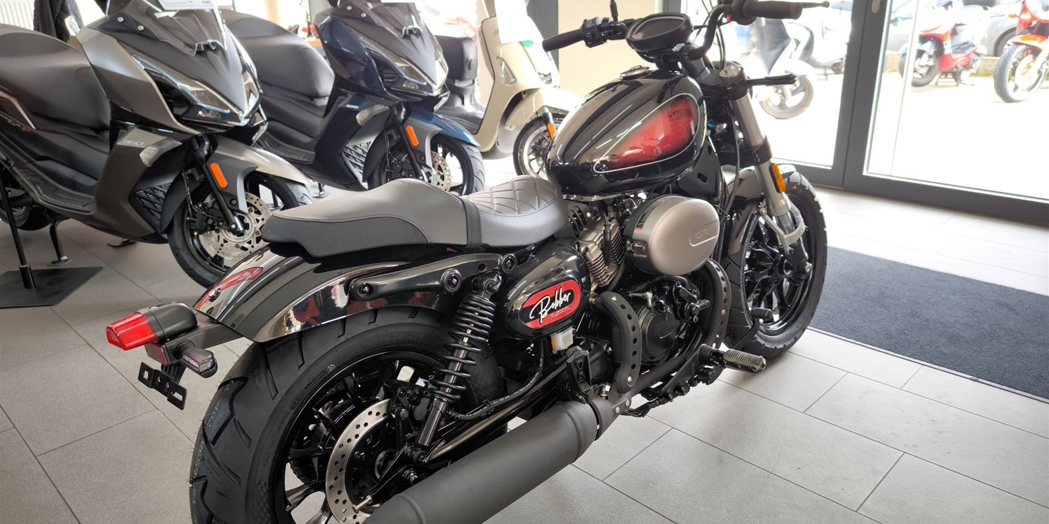 Die neue GV 125i S Aquila EVO ABS begeistert als ultimatives Bobber-Bike. Mit hochwertiger Upside-Down-Gabel für präzisen Fahrkomfort und integriertem ABS für maximale Sicherheit. Das Design mit breiten Reifen, niedrigem Sitz und edler Zweifarblackierung (black/silver matt oder black/crimson red glänzend) ist ein absoluter Hingucker.