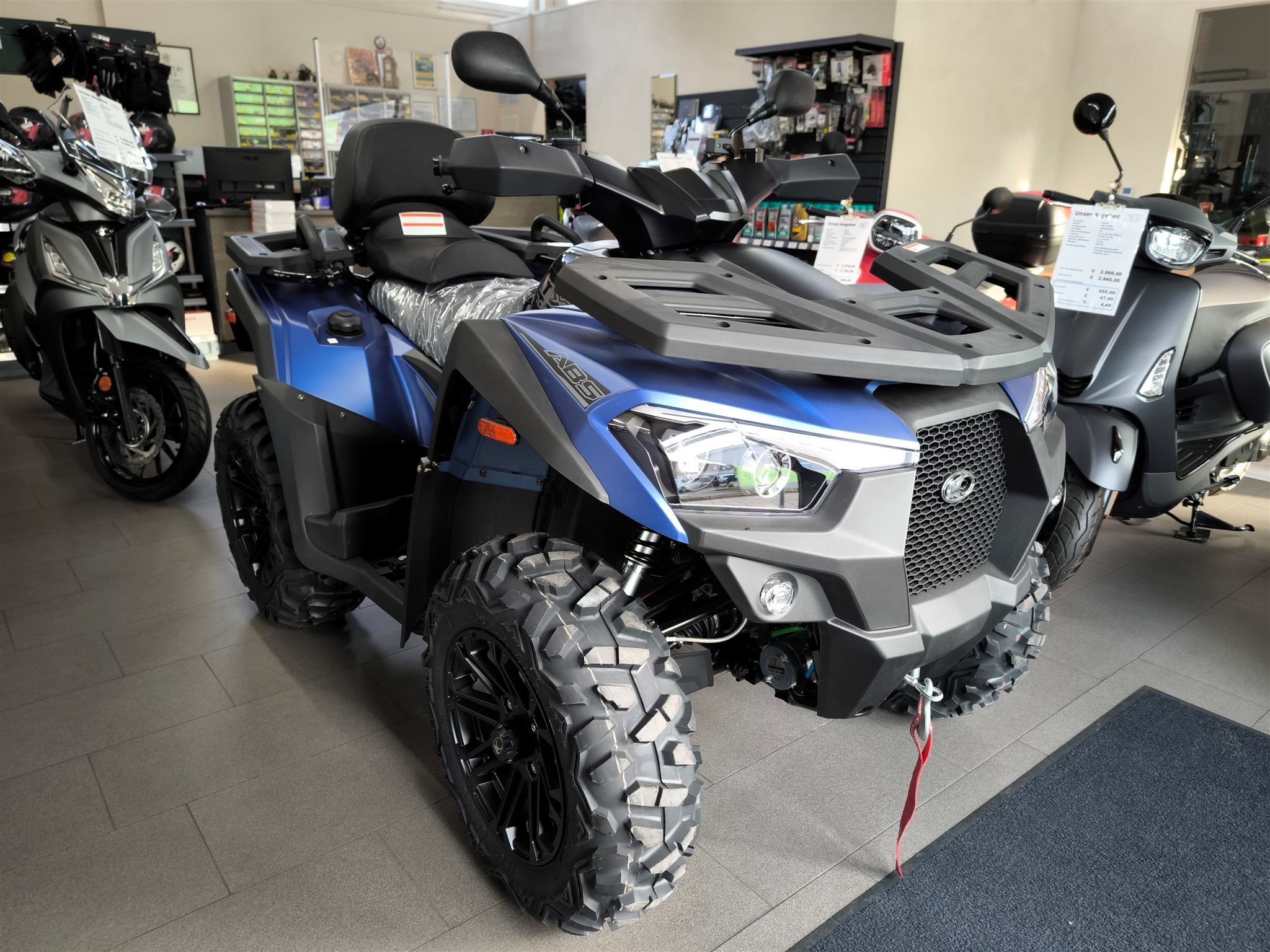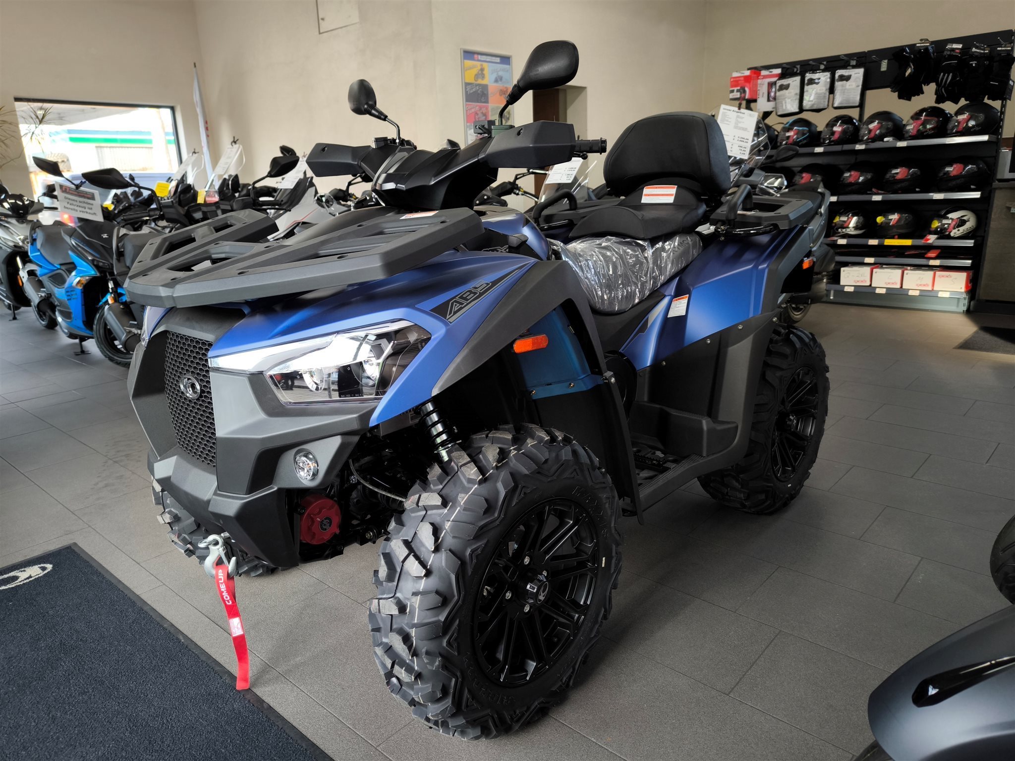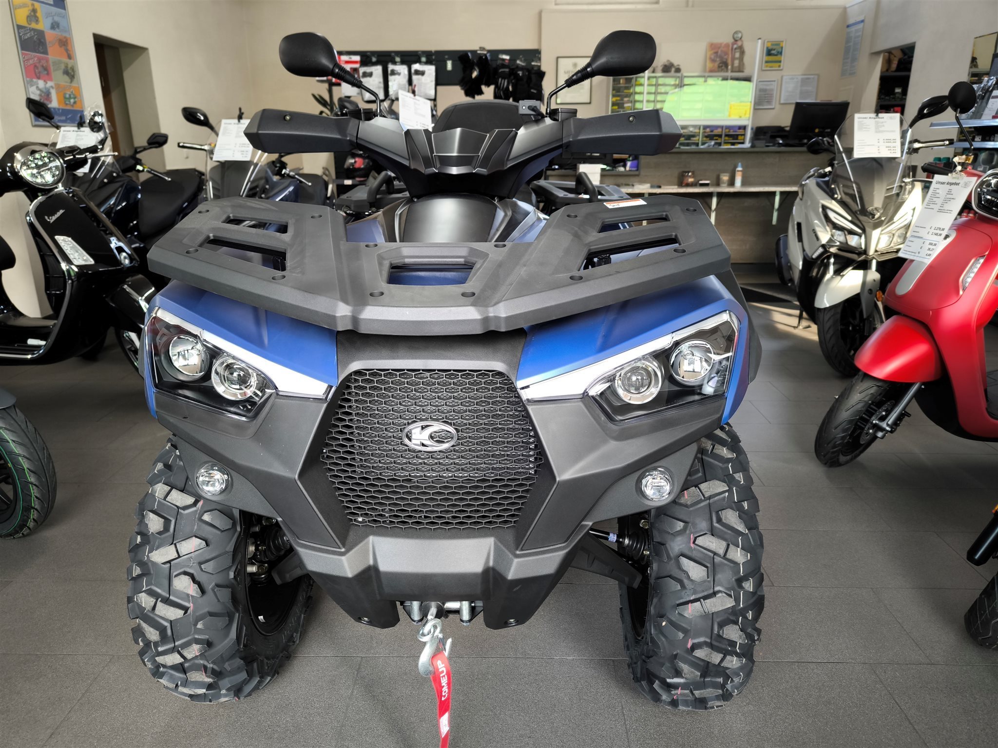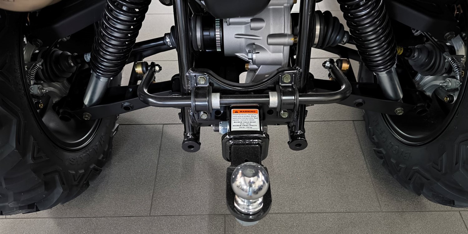 Und das ist noch längst nicht alles. Zur Vollausstattung gehören zum Beispiel eine elektronische Lenkunterstützung, die geschwindigkeitsabhängig reagiert, eine kräftige Seilwinde, stufenlose Variomatik, zuschaltbarer Allradantrieb und Differenzialsperre vorne, Untersetzungsgetriebe, Bergabfahrhilfe, Anhängerkupplung, zentrales LCD-Cockpit und sportliche Doppelspeichen-Felgen mit Maxxis Bighorn Reifen.