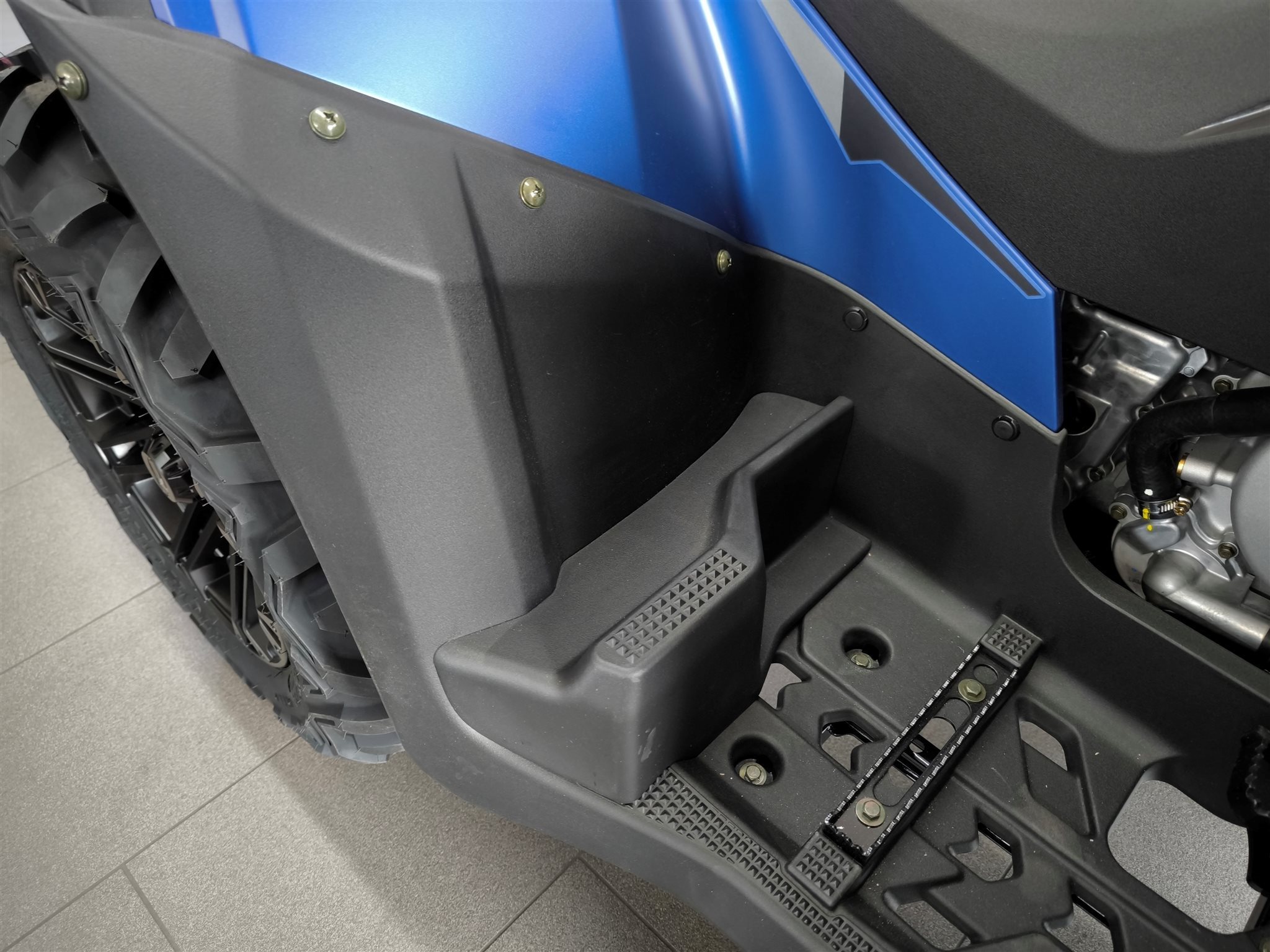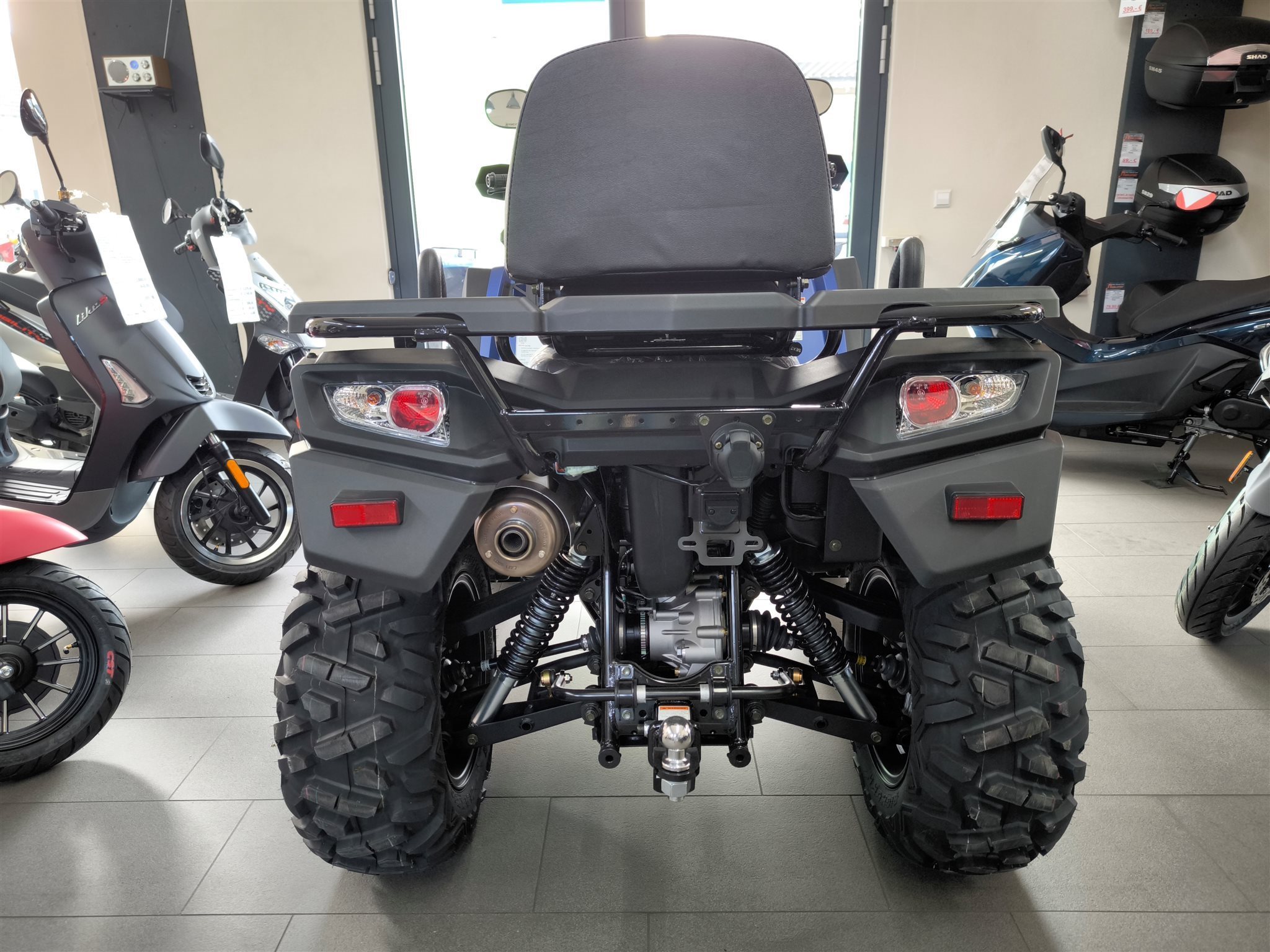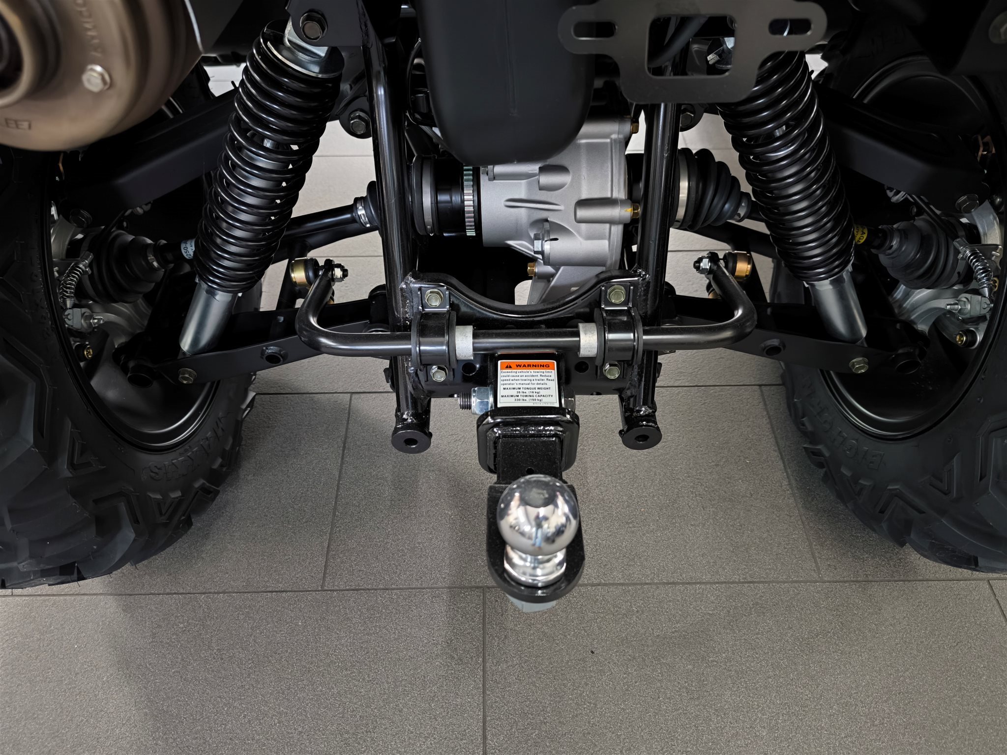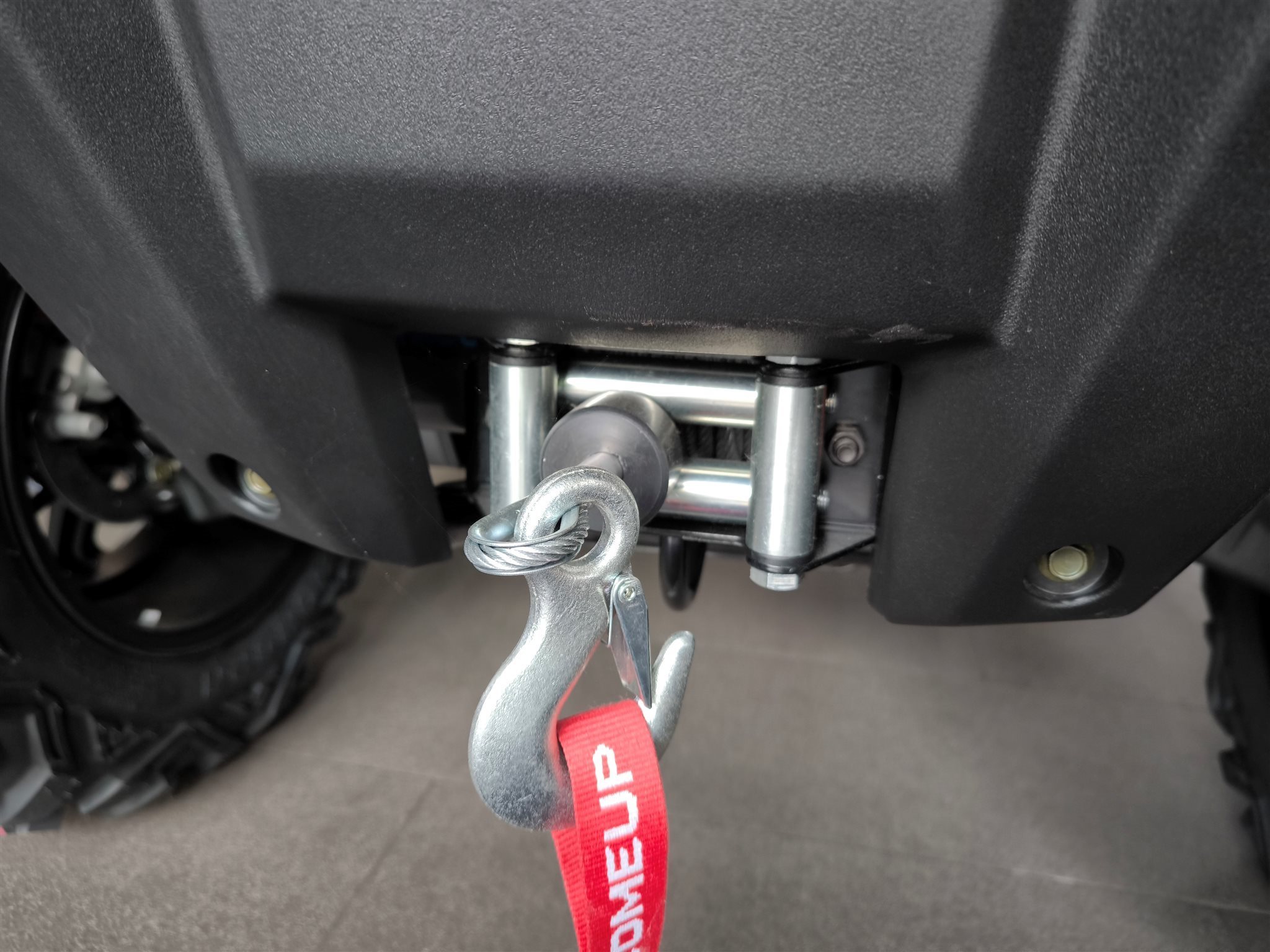 Und das ist noch längst nicht alles. Zur Vollausstattung gehören zum Beispiel eine elektronische Lenkunterstützung, die geschwindigkeitsabhängig reagiert, eine kräftige Seilwinde, stufenlose Variomatik, zuschaltbarer Allradantrieb und Differenzialsperre vorne, Untersetzungsgetriebe, Bergabfahrhilfe, Anhängerkupplung, zentrales LCD-Cockpit und sportliche Doppelspeichen-Felgen mit Maxxis Bighorn Reifen.